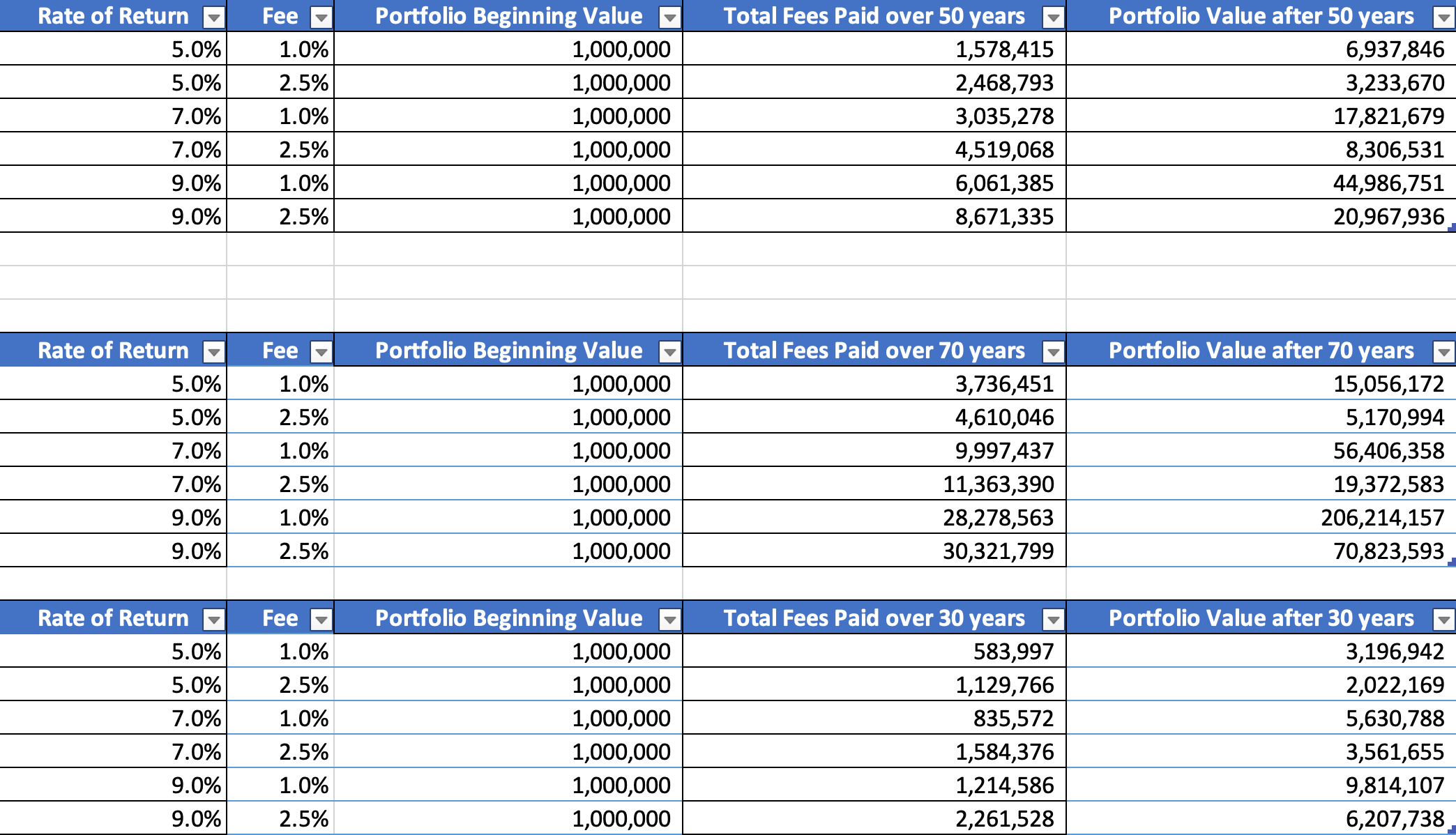 In this case, over an investment horizon of fifty years, the second investor would end up with twice as much money. Over seventy years, the second investor with lower fees would end up with three times as much money. Here are a few actual examples:
